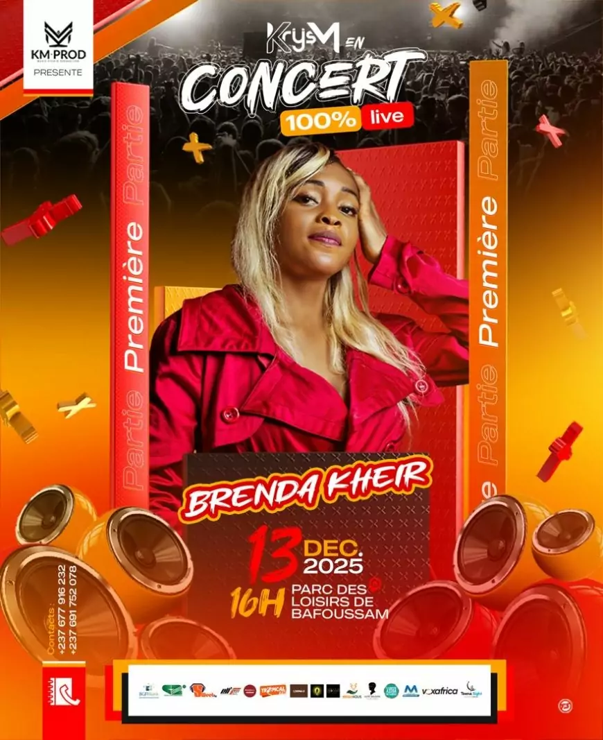 L’artiste camerounaise s’apprête à enflammer la scène du Parc des Loisirs Paul Biya de Bafoussam. KM Prod présente un concert 100% live prévu pour le 13 décembre 2025 à partir de 16h, dans le cadre du concert 100% live de Kyrs M .