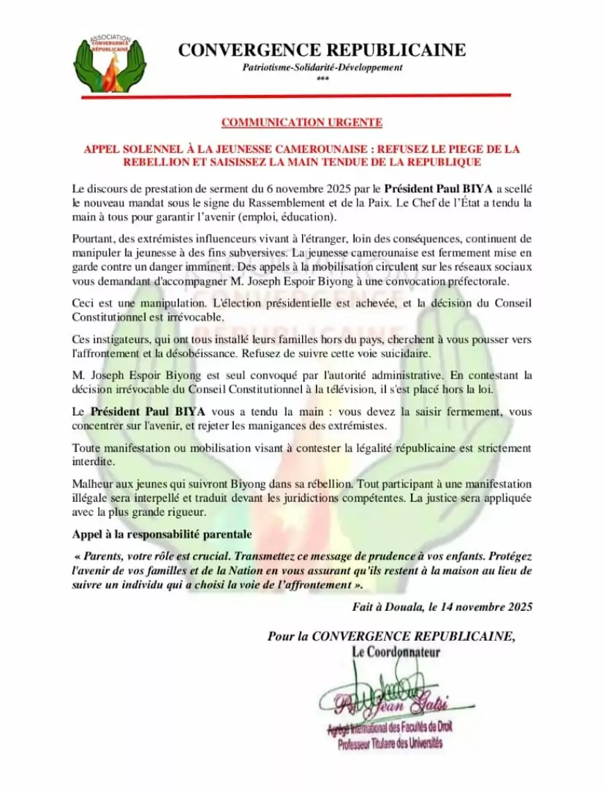 Dans une déclaration publiée le 14 novembre 2025, l’association condamne fermement les appels à la mobilisation lancés depuis l’étranger, notamment autour du leader politique Joseph Espoir Biyong, en réaction à sa convocation préfectorale. Pour la Convergence Républicaine, ces appels relèvent d'une manipulation dangereuse orchestrée par des extrémistes "installés hors du pays" et qui incitent les jeunes à s'engager dans une voie "suicidaire".