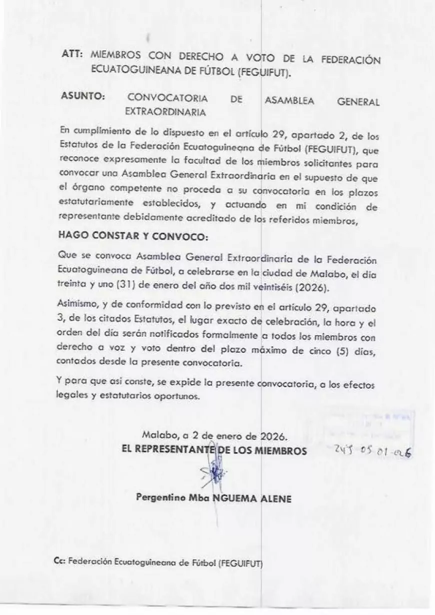 Dernier épisode en date : Pergentino MBA NGUEMA ALENE se prévaut du statut de « Représentant » de certains membres disposant du droit de vote pour convoquer une assemblée générale extraordinaire de la FEGUIFUT. Or, aucune procuration notariée n’a été produite pour justifier cette représentation, laquelle n’existe d’ailleurs pas dans les statuts de la fédération.