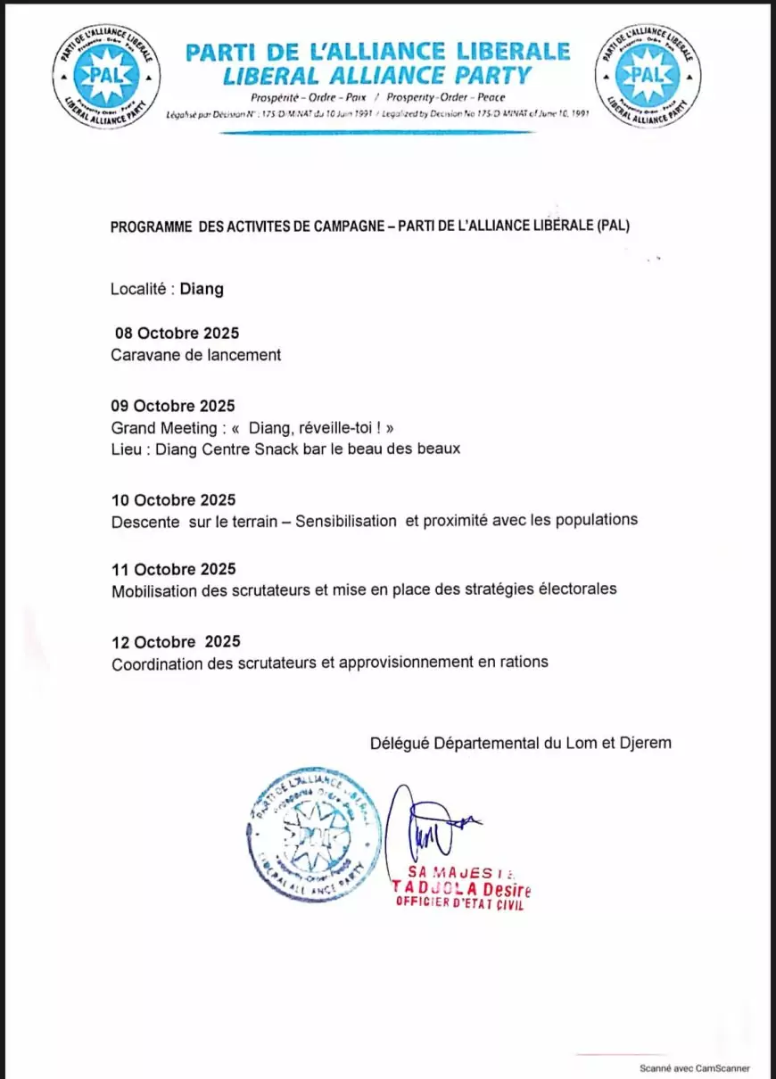 Meetings des candidats alliés à l'UNDP de BELLO BOUNA MAÏGARI dans les localités d'Abong-Mbang dans le Haut-Nyong et Diang dans le Lom et Djerem les respectivement les 7,8 et 9 octobre 2025 prochains.