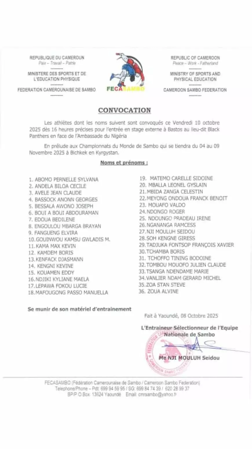 Soucieuse de doter ses sambistes de rudiments techniques adéquats en vue d’une participation honorable aux prochaines joutes mondiales de Sambo prévues du 04 au 09 Novembre 2025 à Bichkek au Kirghizistan, la Fédération Camerounaise de Sambo via l’entraîneur national Me Nji Moluh Seidou, vient de convoquer 36 athlètes pour un stage externe qui débute ce vendredi 10 Octobre 2025 à Yaoundé en prélude à ladite compétition.